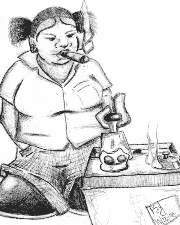 Sandra used to be a co-worker about a year ago at a restaurant I used to work at. She's a cook, as you can see, heh, and yes, she did smoke when she cooked.. she was great. Done in penci.
